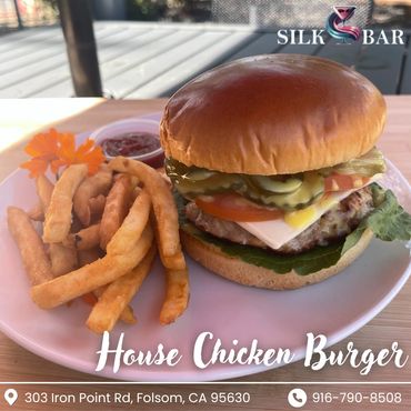 • Brioche Bun | House-made Chicken Patty | Seasoned with Tajin | Layered with American Cheese | Tomato| Lettuce | Salted Onions. • Served with: House-made French Fries or Salad | Special House Dip.